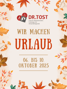 Liebe Patienten, wir haben vom 06.10. bis 10.10.2025 Urlaub. Unsere Vertretung übernehmen dankenswerterweise: Praxis Dres. Aleksandar Griesser und Katja Heim, Nordplatz 22, 99817 Eisenach, Tel. 03691/818112 Frau Ludmilla Jadranski, Hauptstr. 28, 99846 Seebach, Tel. 036929/87920 Praxis Dres. Schrön, Am Gebräun 4, 99817 Eisenach, Tel. 03691/886433 Ab dem 13.10.2025 sind wir gerne wieder für Sie da!